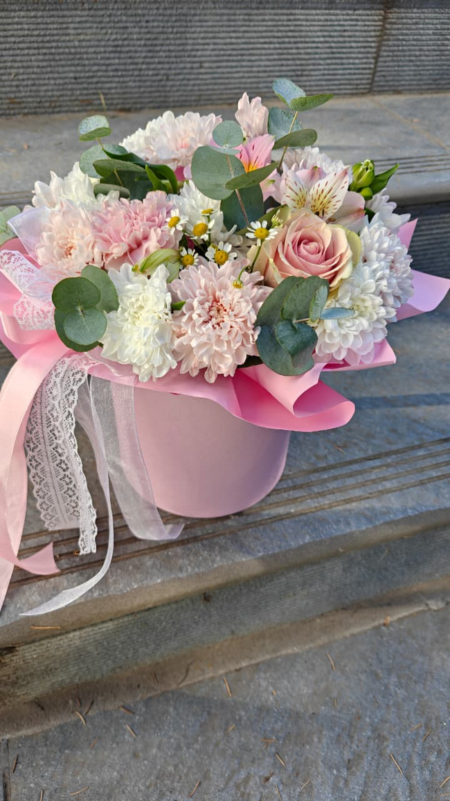 Стойкая нежная композиция в шляпной коробке со скидкой 50% от салона «Vega Flower»