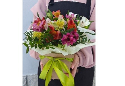 Стойкая альстромерия микс в коробочке с оформлением со скидкой 50% от салона «Vega Flower»