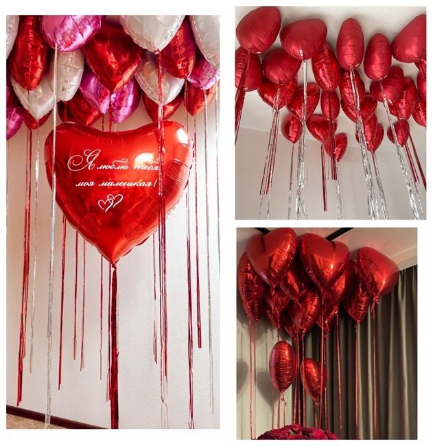 - Композиция «Любовь»: 1 большое фольгированное сердце, 6 стандартных фольгированных сердец (или звёзд), 3 шара с конфетти - 2350 рублей вместо 4700.