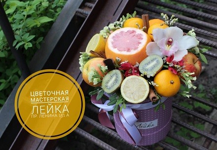 Оригинальный букет из фруктов и цветов в шляпной коробочке скидкой 50% в "Лейке" на проспекте Ленина