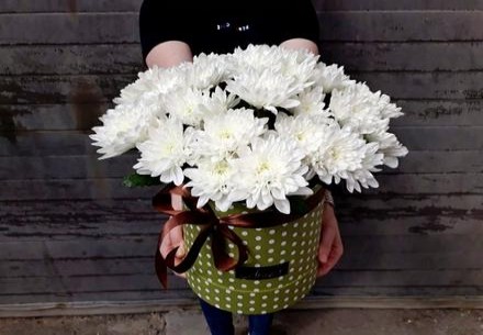 Букеты и шляпные коробки с хризантемами XXL от цветочной мастерской "Лейка" со скидкой 50%