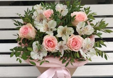 - Нежные розы и альстромерия в крафт коробке – 2480 рублей вместо 4960.